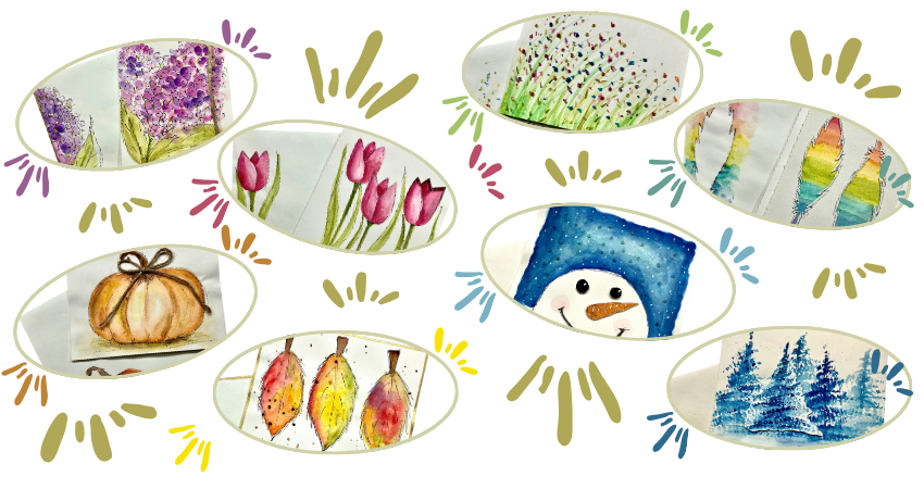 Learn to create 8 fun,colorfulwatercolor greeting cards...2 for each season!